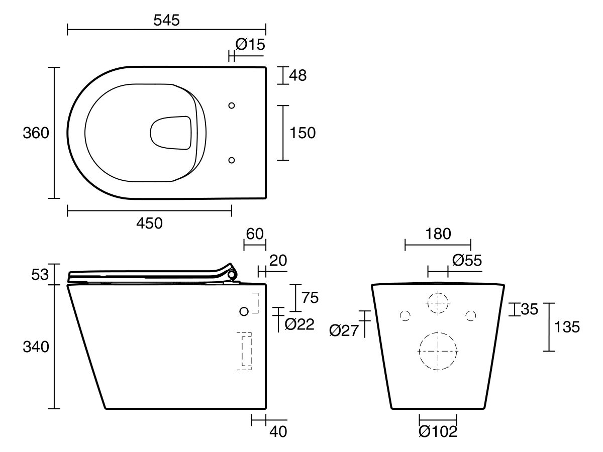 2D DWG - Kado Lux Rimless Plus Wall Hung Pan with Soft Close Quick Release Thin Seat White (4 Star)
